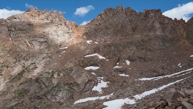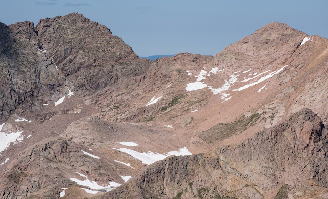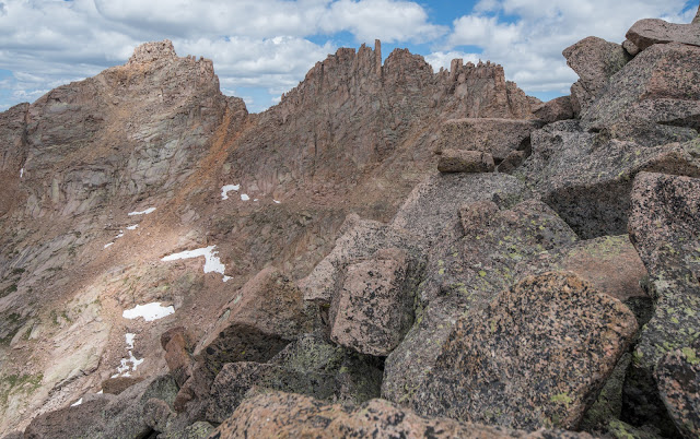 Sunlight Spire, still looking at least as dramatic as it has when we've seen it before this, and Windom Peak, looking a lot harder than Class 2 at this point...happily, we weren't going up that nasty face, but traversing right of the edge of this shot and route-finding up a boulder/talus slope to gain the more gentle, but still very rugged blocky ridge.