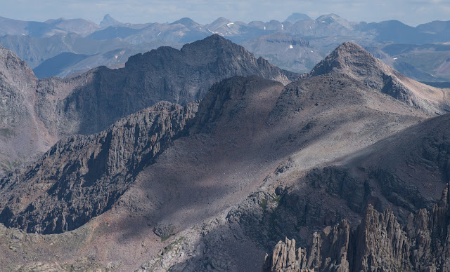 Detail shot on Mount Eolus (left) and North Eolus (Right) from the Sunlight peak summit area.