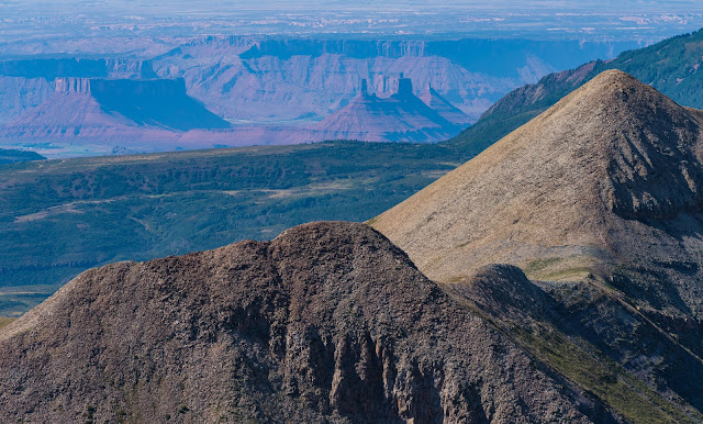 "I'm pretty Mount Sneffels is right there..." (Dave was fascinated, as we left Colorado, in locating Mount Sneffels; I told him some of the western San Juan Range in Colorado could, on a clear enough day, be seen from certain areas within Utah's La Sal Range. We could definitely see the San Juans (just barely) through the haze, and we think we saw Mount Sneffels among those peaks, which is possible, but I couldn't see it well enough to say for sure how it appears from that perspective.