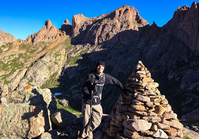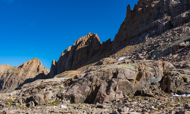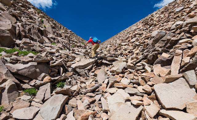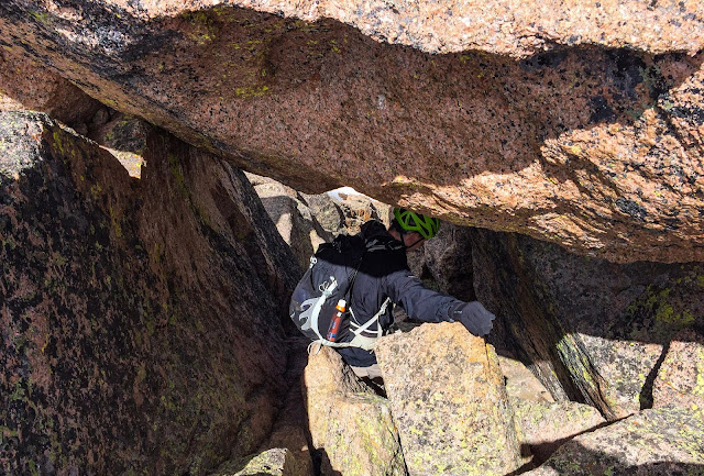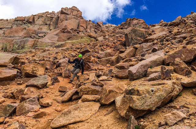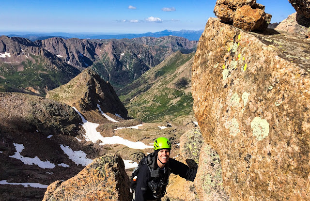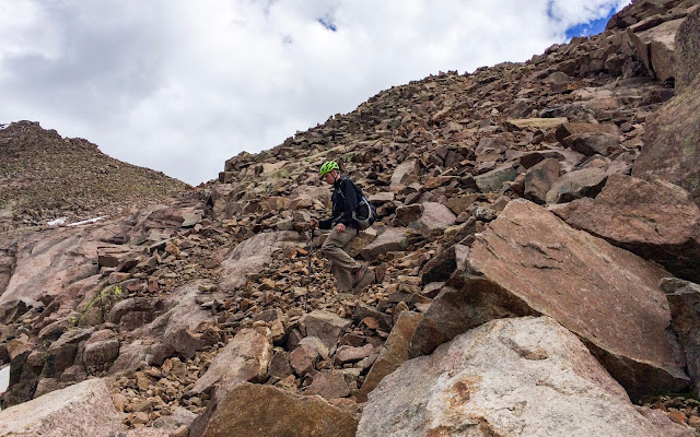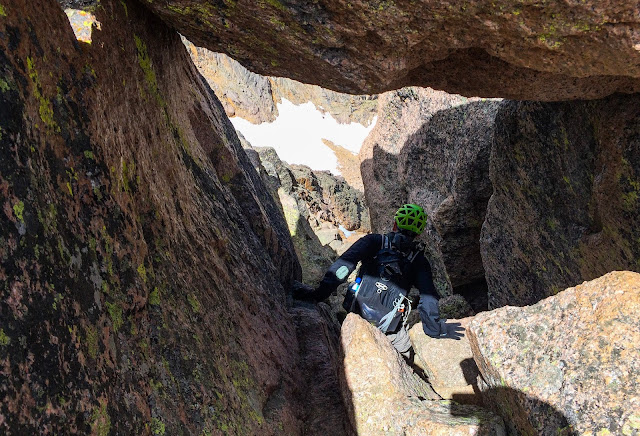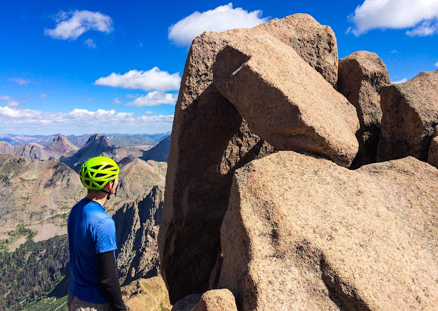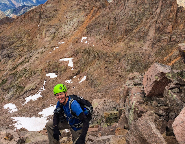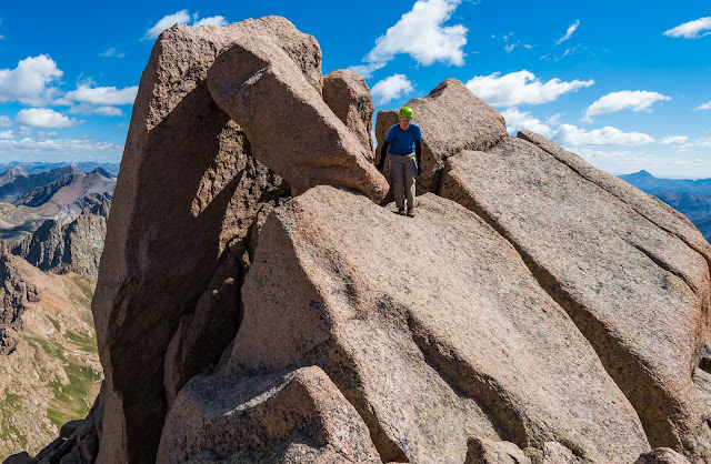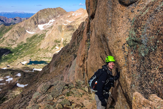 Once you get up to the high saddle at the top of the terrible chute the terrain changes - becoming much more rocky. I strongly recommend having some good beta (route detail) with you on your ascent here; there were cairns but they weren't as numerous or as clear as what we had seen on Mount Eolus the previous day. Also, much of this scrambling is quite physical - meaning big moves are required to advance - big steps and reaches, and some interesting postures required at various times. A lot of the scrambling isn't really exposed, but the moves required to advance across the terrain were the most physically intense of the whole trip, without question.