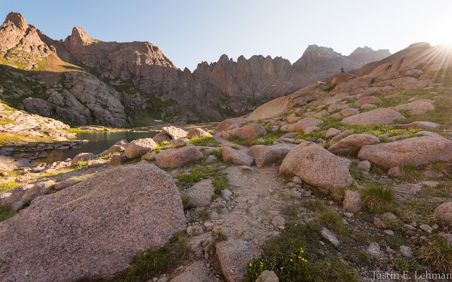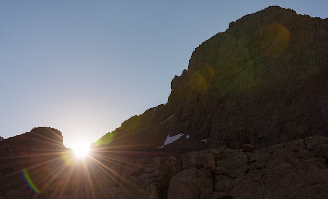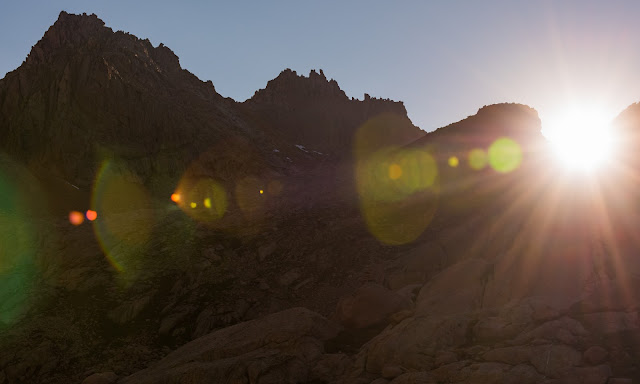 The moment when the sun just crests the high saddle across from Twin Lakes.