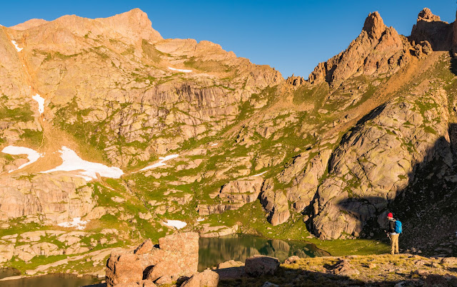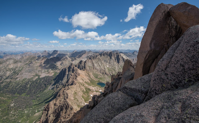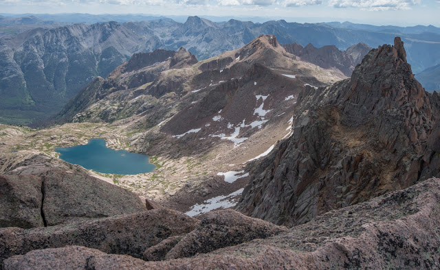 Looking down over Sunlight Lake and another basin on the other side of Sunlight Peak.