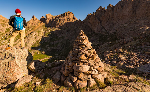 Me, standing by one of the massive cairns in the high basin above Twin Lakes. (Photo by Dave)