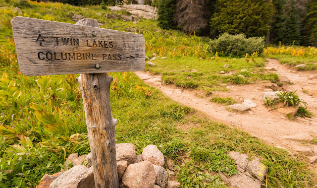 Trail sign at the junction of Twin Lakes and Columbine Pass. To do Mount Eolus/North Eolus/Sunlight Peak/Windom Peak you take the left fork here.