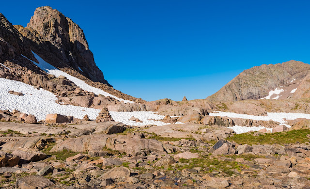 Looking back in the direction we'd come; you can see some of those huge cairns popping up occasionally. The Twin Lakes would be visible well below the edge of that saddle area in the middle of this shot.