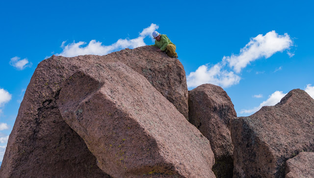 Dave captured the moment of me staring at the huge summit blocks...this was the point where I was trying to decide if I was really going to commit myself to what would be required to get up to the true summit... (Photo by Dave)