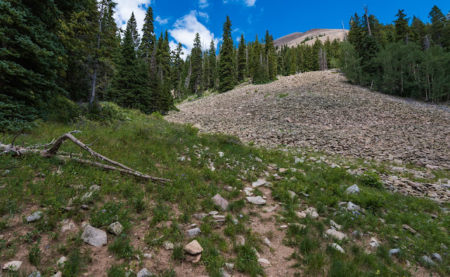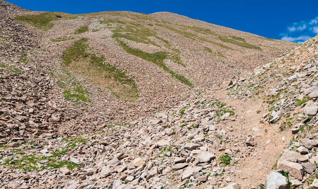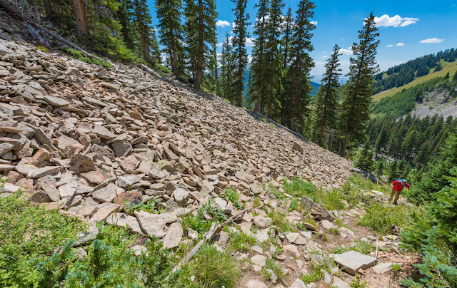 The trail, nicely keeps you off the problematic talus almost the whole way up the peak.