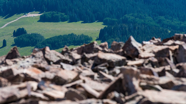 Neat contrasts between the summit of Mount Peale and the meadow far below, near which we parked. My car is the center one of the three closest to the meadow here. The zoom lens on the camera messes with the perspective a bit, but there's a good bit of horizontal distance between the parking area and the summit of Mount Peale.
