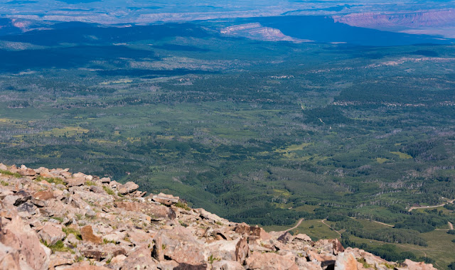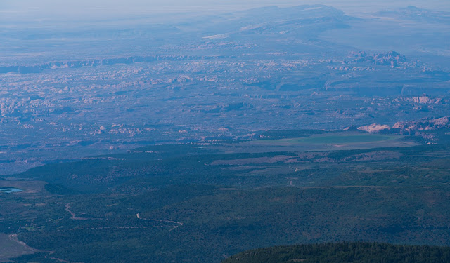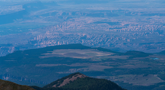 More terrain contrasts between the top of Mount Peale, the thickly forested terrain below, and some of the canyon areas beyond that.