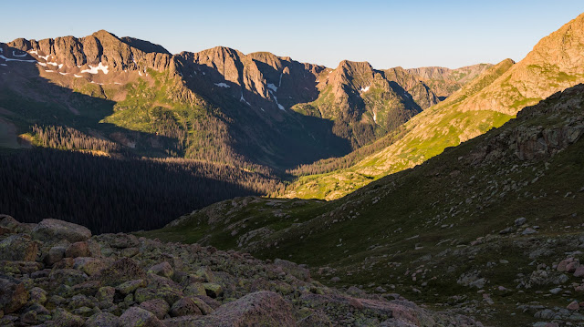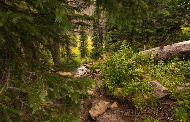 We hiked out about the time sunset was happening but it was mostly overcast, and Chicago Basin itself really isn't the best place to catch sunset shots anyway, so I wasn't too distracted by amazing light like I often am when hiking through beautiful country early or late in the day. Our pace was quick on the descent to the Needle Creek junction; I don't recall offhand how long it took us, but we covered the terrain pretty quickly and were able to find a very fine suitable space located a bit off the main Purgatory Trail. We set up a simple camp in the dark, and happily surrendered consciousness to a well-earned and restful sleep.