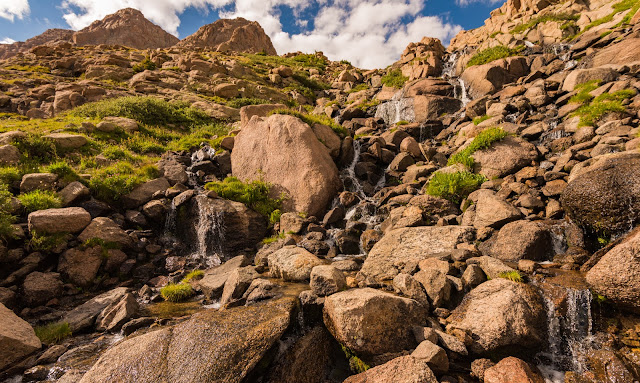A little above the Twin Lakes I came across this stream of water pouring out of a rock wall - it was maybe two or three feet off the ground, but flowing vigorously enough that you could fill water bottles out of it. It caught my eye because I heard water and couldn't see anything flowing off the top of the rocks around me, so I looked around and found this little stream coming right out of the side of the rock a bit off the ground and just took a moment to enjoy the sight.