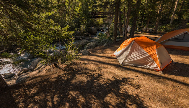 A wider view of the campsite we stayed at overnight; this is nearer to the creek than you really should be, but we weren't sure about the layout of things since we made camp in the dark and at the end of a high mileage/high elevation gain/loss day...oh well...at least it was scenic...We did make sure to go way out in the woods away from the creek for any bathroom needs.