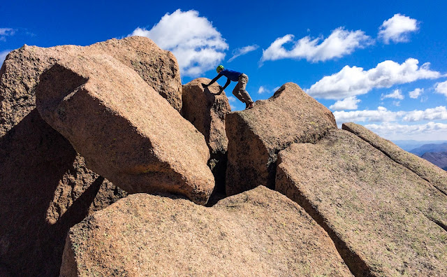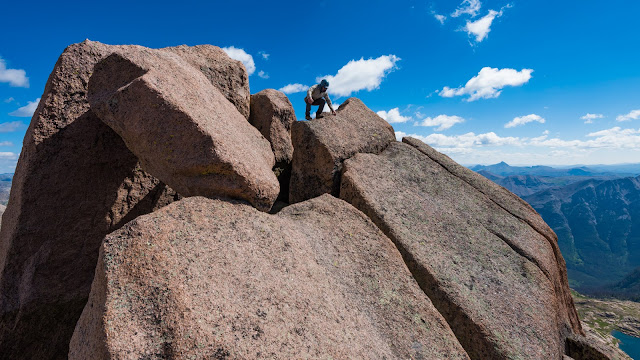 Matthew carefully climbs off the summit block after sitting on it briefly. This shows, probably best of any shot I have, how large the step down from (and, before this, up to) the second to last block to the final summit block is...If it wasn't crazily-exposed it would be a relatively simple boulder scrambling move...but the psychological effect of the extreme exposure immediately to your right (there's nothing there!) as you make the large scrambly move up/down here is very real and definitely registers strongly on the "intense scale".