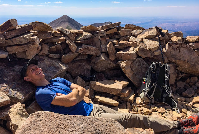 Mount Peale has, by far, the most comfortable summit wind shelter I've ever enjoyed on any peak...I was hoping this seemingly-perfectly-formed simple rock structure was still there. I loved this on my first ascent of this peak back in 2014 and remember commenting how it was comfortable enough up there to take a nap on if need be. I had to shift a rock or two out of the way that had been interpolated into the set-up unnecessarily over the years, but this picture well-captures the bliss I felt at once again enjoying the most comfortable recliner I've ever found on a mountain.