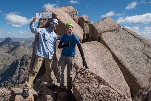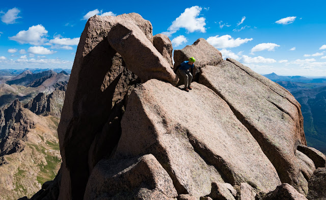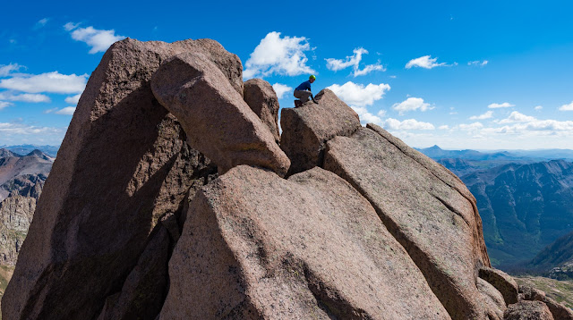 Sunlight Peak's summit is comprised of very large blocks jumbled together; these blocks are, on three sides, astonishingly exposed...far more so than what the pictures usually suggest. To gain the summit you have to scramble rapidly up and then carefully across a very large down-sloping block about 15 - 20 feet across (as soon as you make this first move the rest of the time you're exposed to a severe or fatal fall getting to the summit and back), then you work your way sideways across the top of the block toward the "far side" of the jumble of massive boulders (I used the top edge of the very large rock to grip on to as I moved sideways), then you have to scramble up a 6 foot or so slanted block, using a large crack between it and another block as a foothold, then you're presented with about a 3 foot horizontal gap with an 8 foot (or so) vertical gap between it and the rock you're standing on, and you have to stretch yourself across this gap to scramble up on top of a higher rock, maybe another three feet higher than the one you're standing on on your side of the gap. At this point you're two blocks away from the summit...You step carefully across the gap, and that's then you see it, from the second-to-last block - all the air - massive exposure in front of you just off the right side of the summit block (I remember calling over to Dave as I got to this point and saying something like "Wow, there's the exposure!")...The edge of the summit block itself that's facing you is another 3 to 4 feet tall, with drop offs on your left and right. Getting up on the summit block would be simple except for the very real mental game that happens there: You've got to get up this sheer-walled block (a simple up-climb of 3 - 4 feet) but there's a drop on your left leading to that eight foot hole - now about double that distance since you're higher up above the hole - and to your left is nothing for hundreds of vertical feet, basically a guaranteed fatal fall...so you get up on that last block quite carefully...