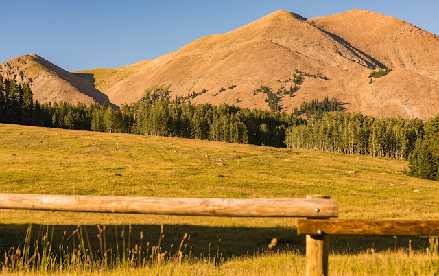 On our way down I enticed Dave into stopping for a few minutes in part of the beautifully thick aspen forest that surrounds this area so I could take a few evening pictures in the lovely golden light before we continued out into the meadow on the other side of the thick woods you pass through.