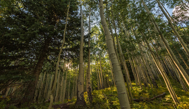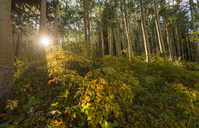 Enjoying some moments of lovely late-afternoon light in the thick aspen forest the trail passes through on our descent from Mount Peale.