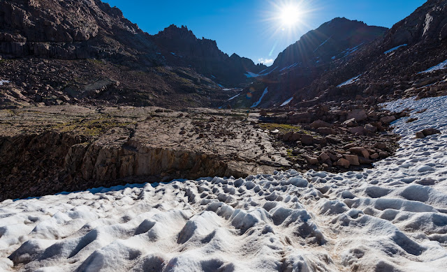 Snowfield we traversed on the way to some "boiler plate" rock slabs on the way to Sunlight Peak. Windom Peak is visible to the upper right here and Sunlight Spire to the upper left; the lower reaches of Sunlight Peak are visible in the uppermost left.