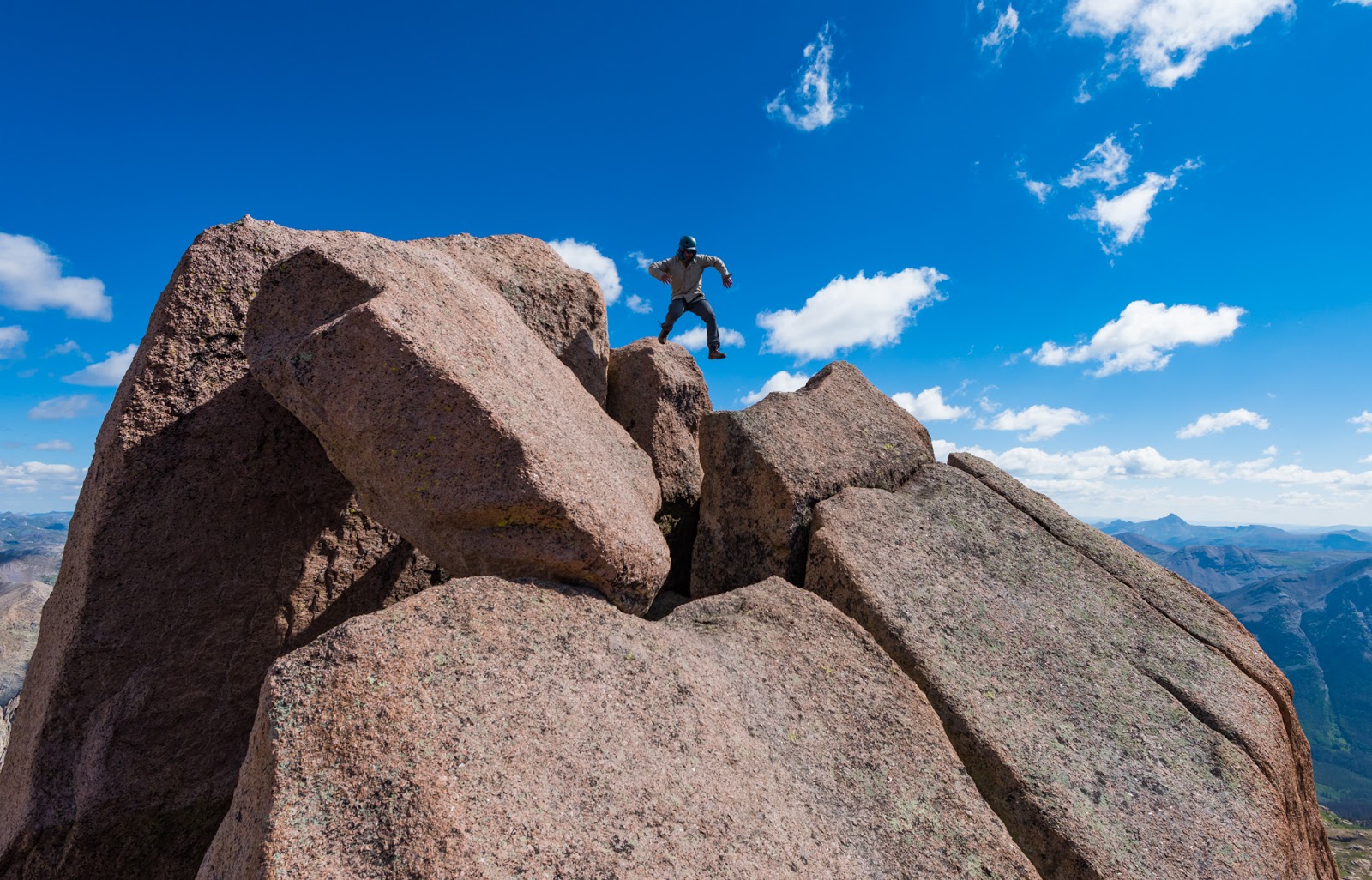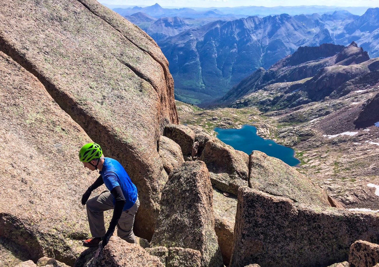 Dave prepares to make the consequential leap across the gap as he descends Sunlight Peak's summit...