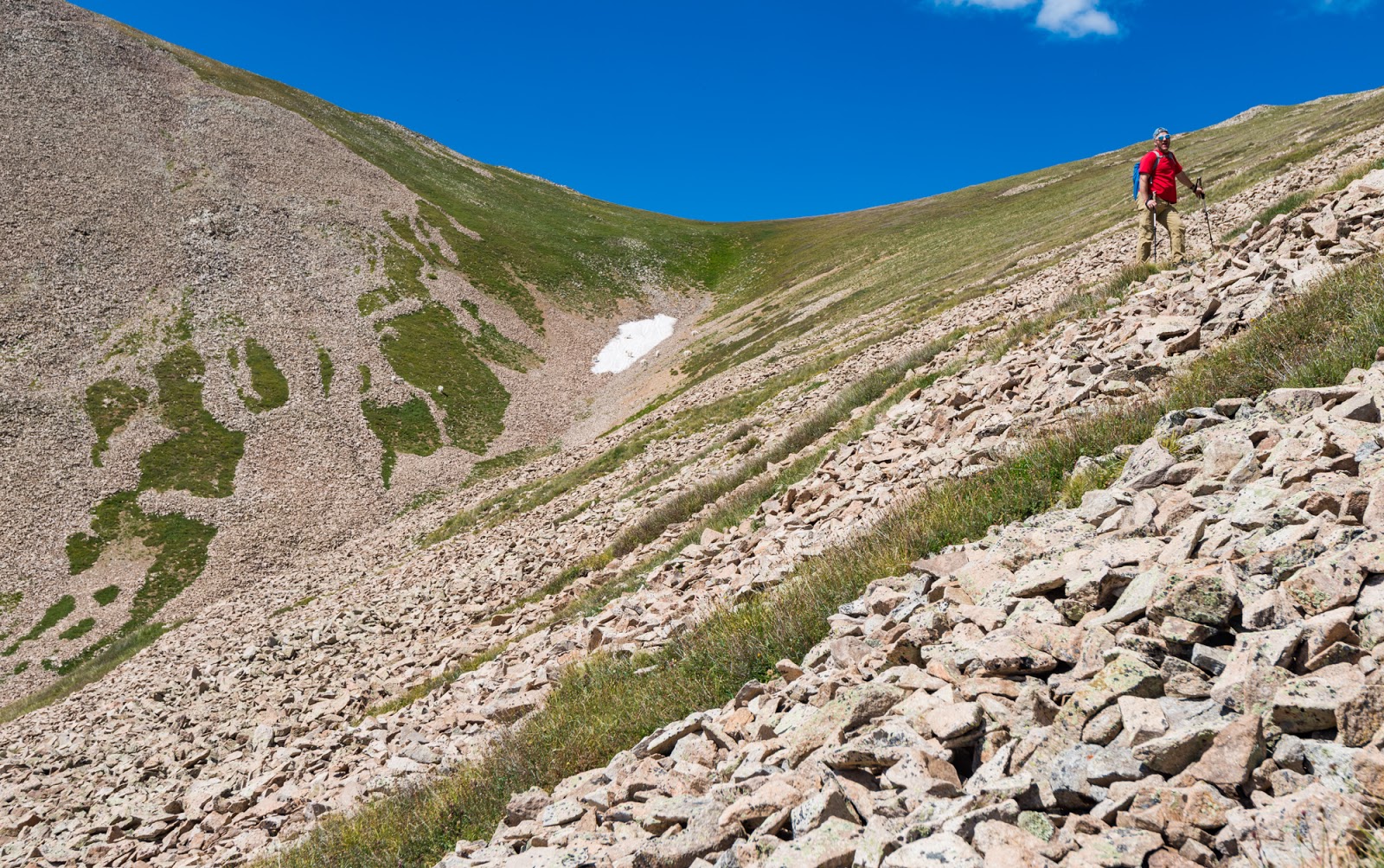 Dave descends steep trail as we work our way down from Twin Lakes to our camp in Chicago Basin.
