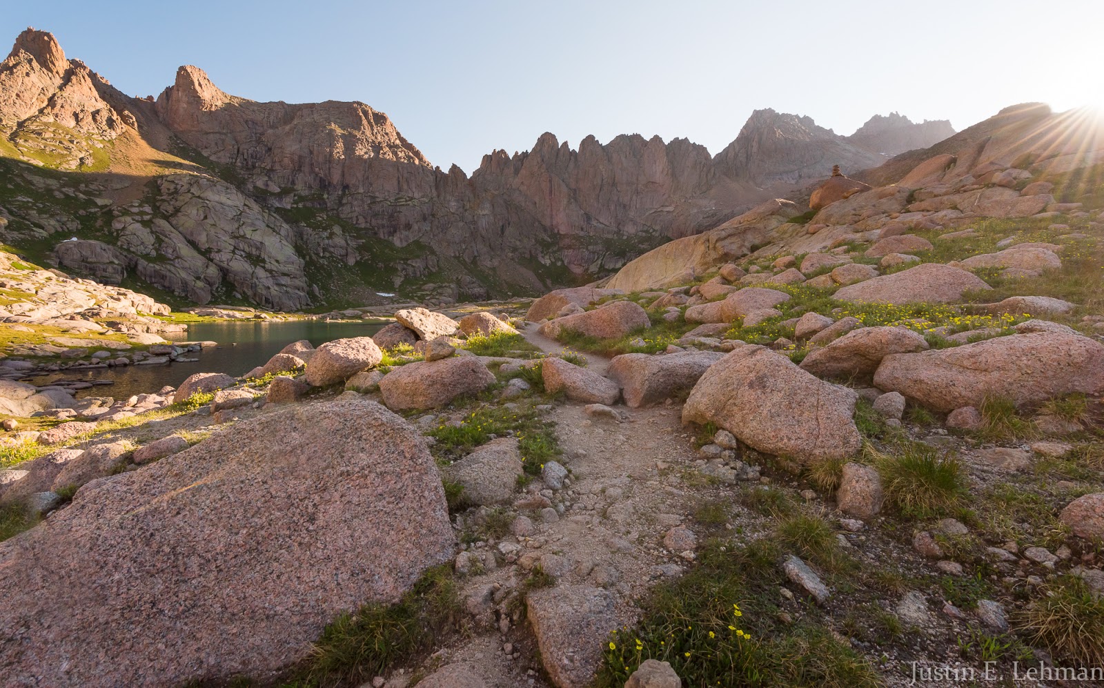 Picking up where the last trip report left off, we got our nice pre-dawn start and began pounding up the trail toward Twin Lakes again. Eolus/North Eolus and Sunlight/Windom Peaks both share a common approach to the Twin Lakes area from Chicago Basin, so we were re-treading the same ground, but we knew what we were in for this time.