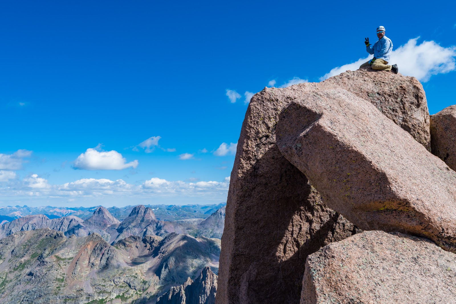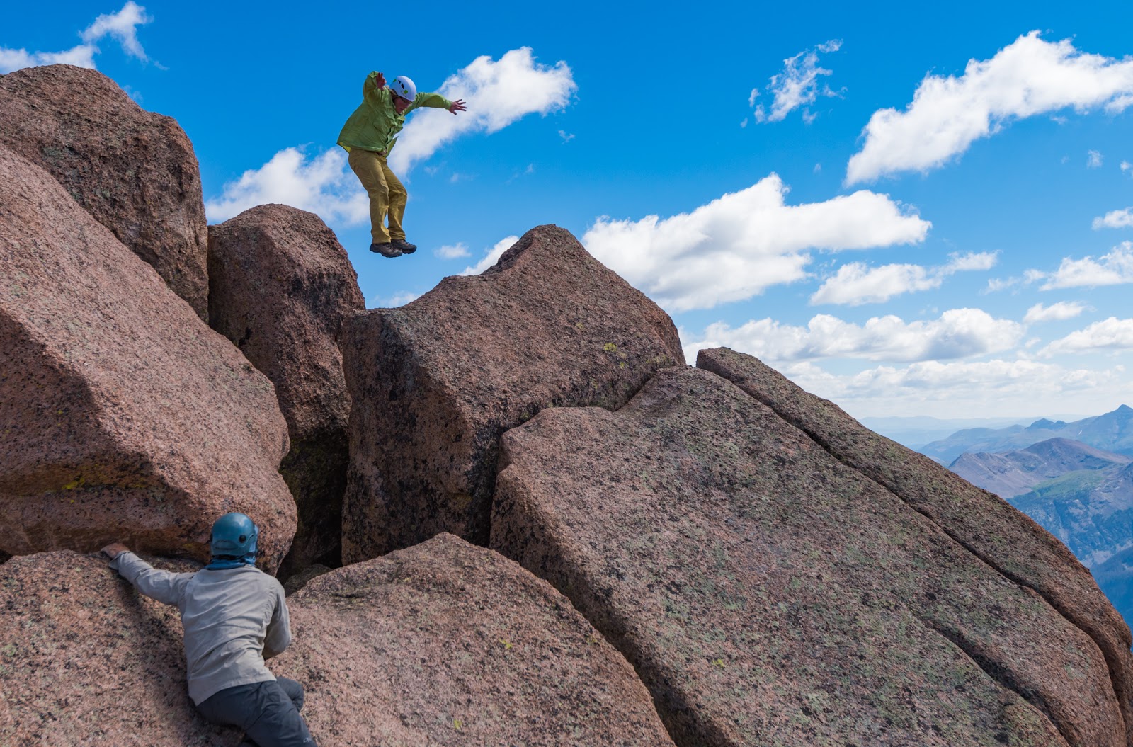 One of the two brothers we met on Sunlight Peak makes the thrilling class 4 jump move on his descent from the extremely exposed summit block after Dave and I had successfully summited.