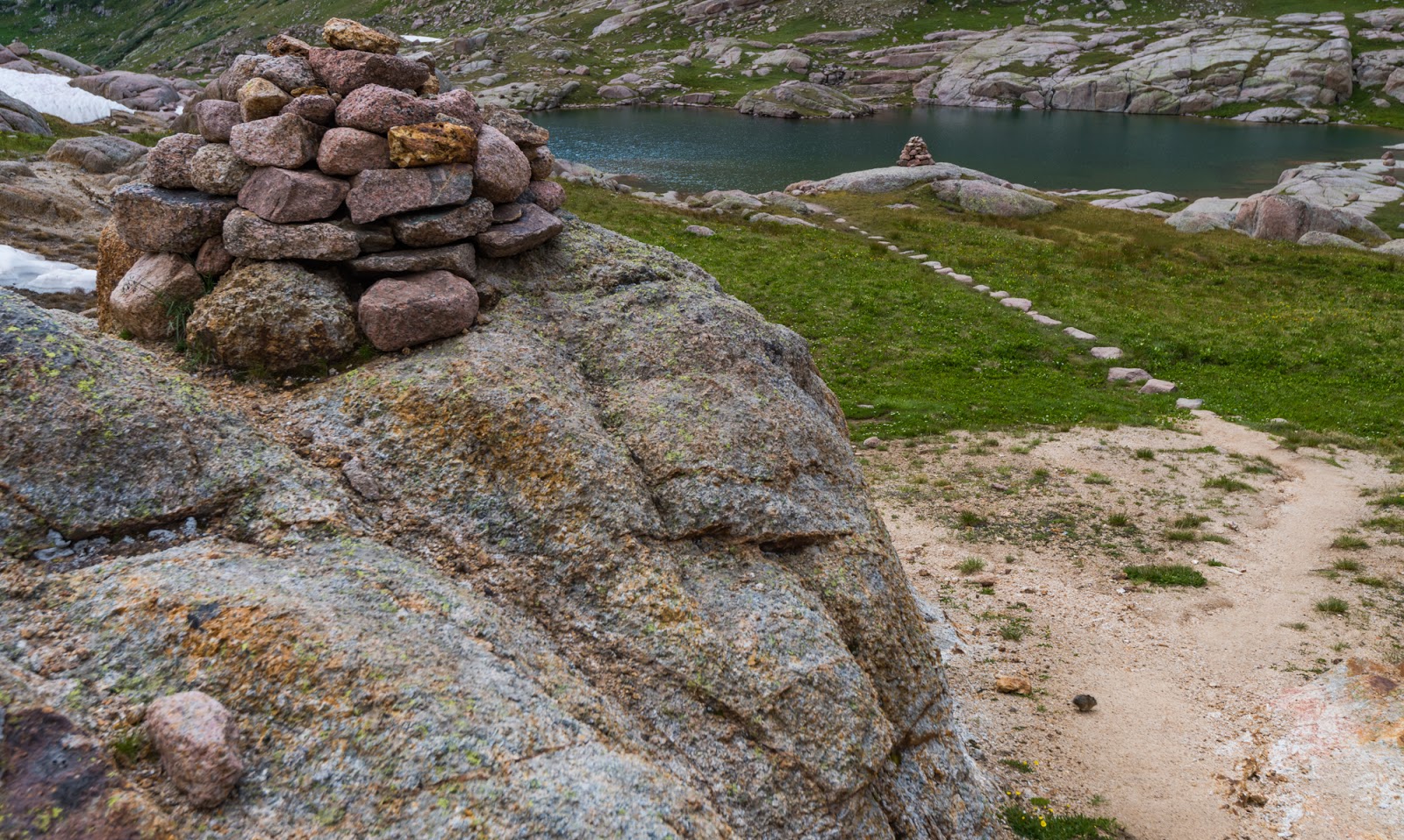 Looking back in the direction we'd come; you can see some of those huge cairns popping up occasionally. The Twin Lakes would be visible well below the edge of that saddle area in the middle of this shot.