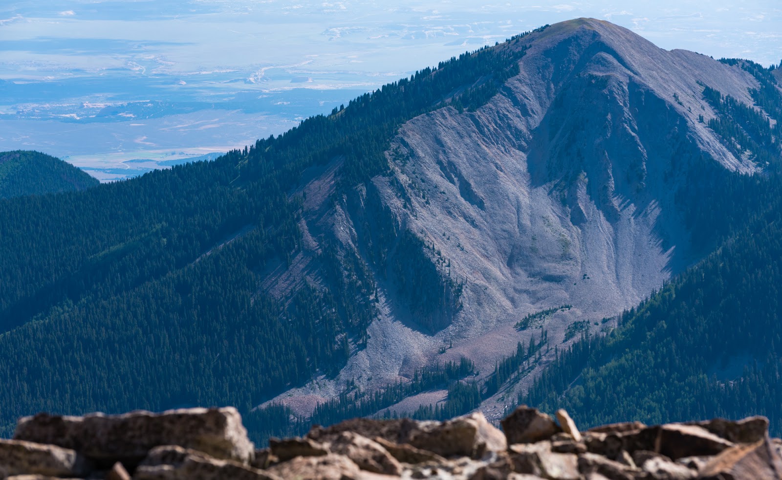 More terrain contrasts between the top of Mount Peale, the thickly forested terrain below, and some of the canyon areas beyond that.