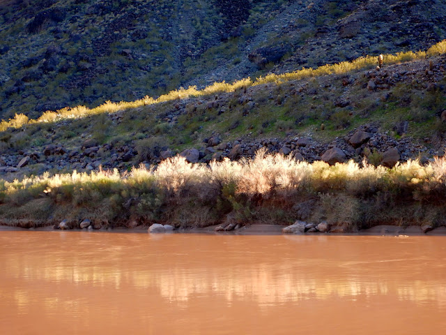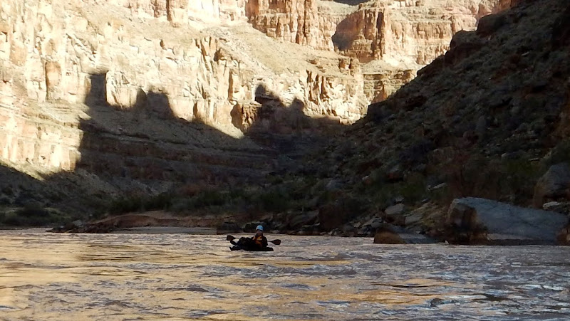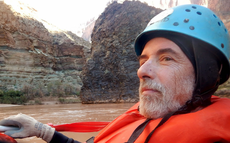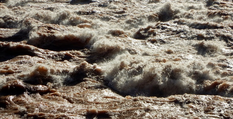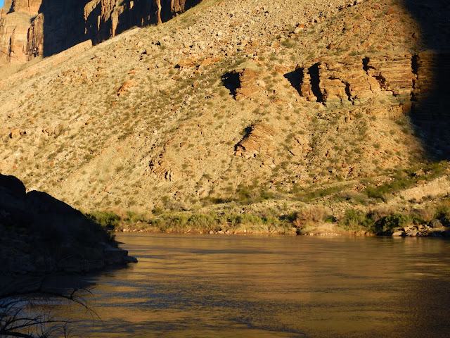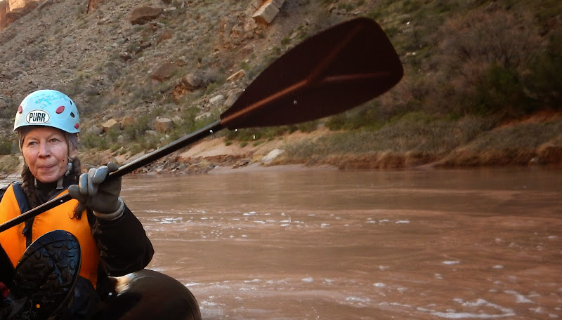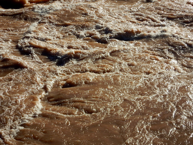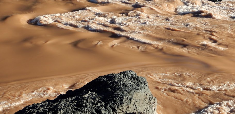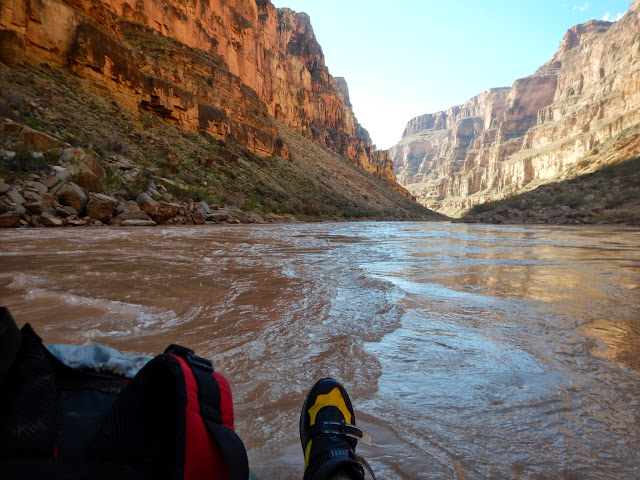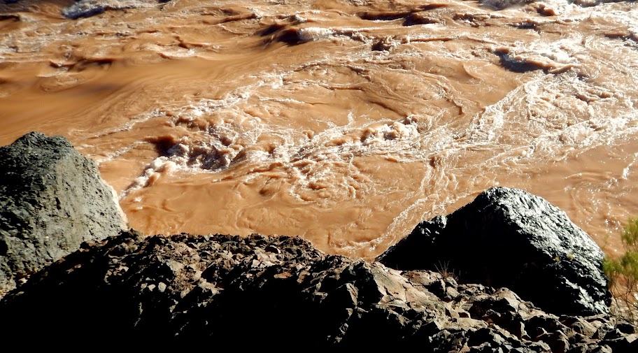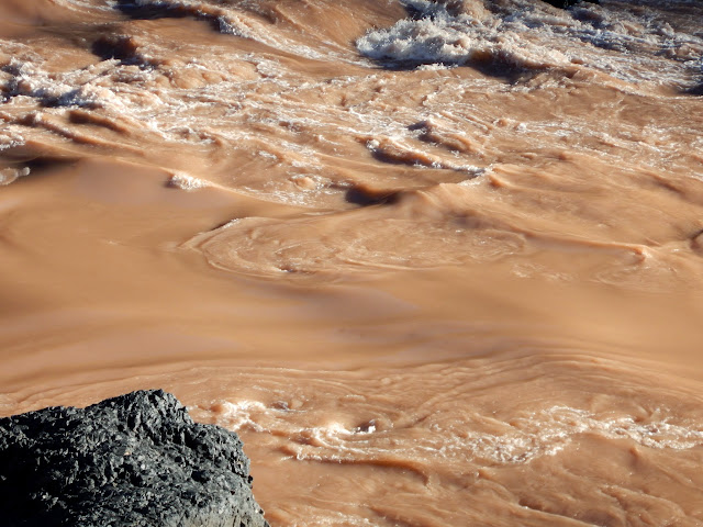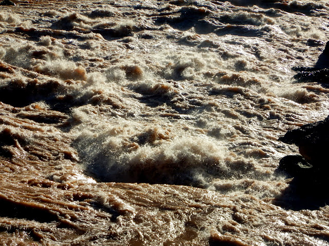 The first riffle seems more like a rapid. We pass on the highest water. Jenny regrets passing on it. I don't. She is a way more experienced boater than I will ever be. I do run a rock garden route, kicking off rocks of lava and once being pinned on such a rock. Very exciting. Not very smart. After days of quiet, heat, sweat, struggle and toil, in a beautiful place....... we are wet, being propelled quickly, in the moment, in the noise, on the edge of rapid and eddy wall alternately.. Brown water spins us, spits us, sends us down, faster than we moved all trip. Five miles passes in a bit under 2 hours of excitement.