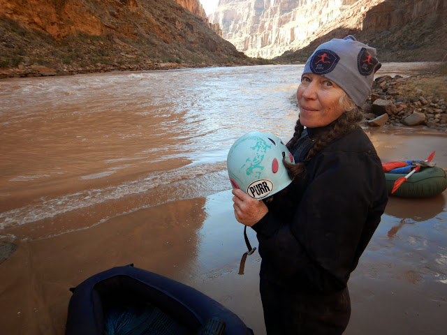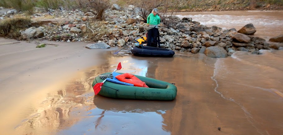 The next day, the terrain grew easier and in spite of Jenny having to build an anchor or so, we landed at the river in the early afternoon. I have done about 50 miles on the river in a pool toy. My memory embraces how much fun I have every time, but conveniently forgets how scared I am every time, readying to launch. Little boat, all my gear, a big turbulent river. What was I thinking? Our friends found the river "pushy" just a few weeks before. I was intimidated.