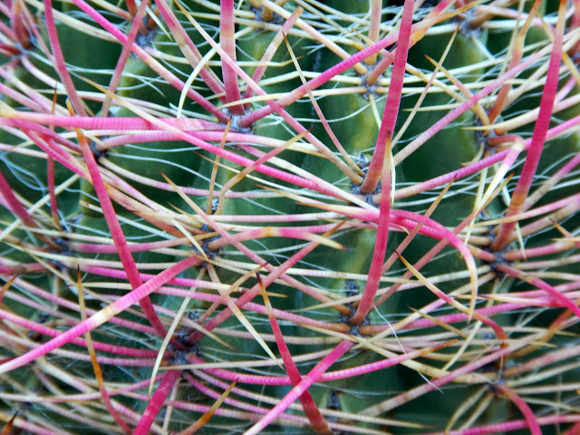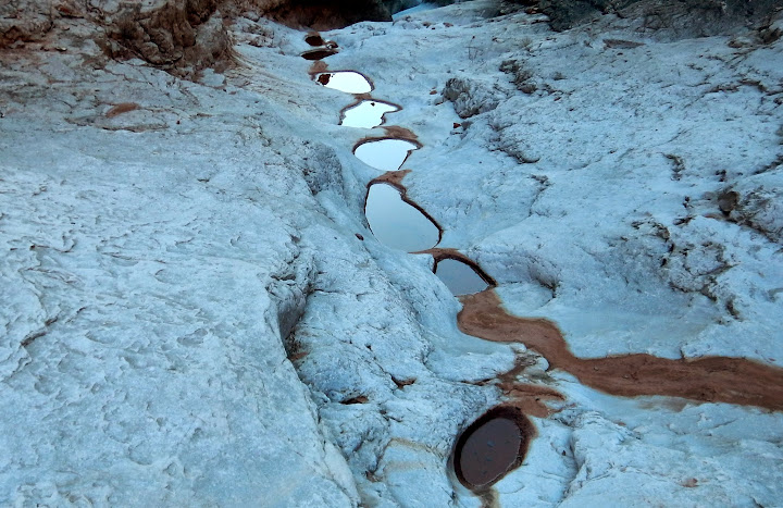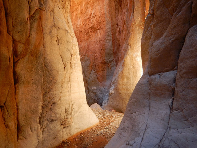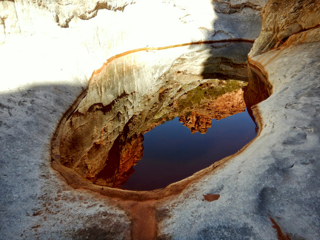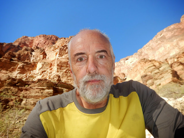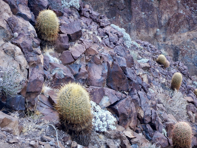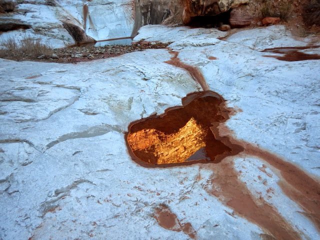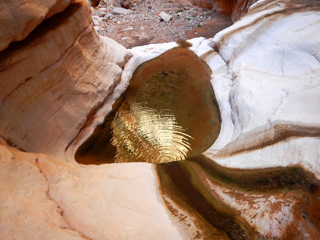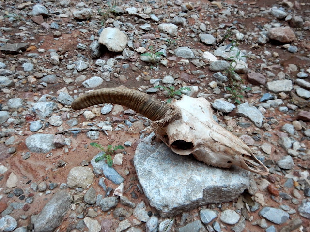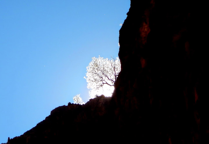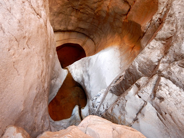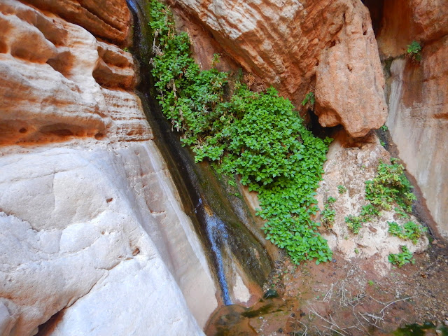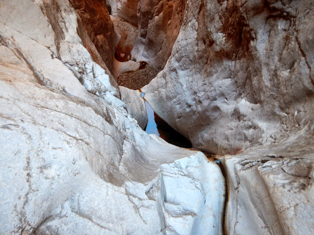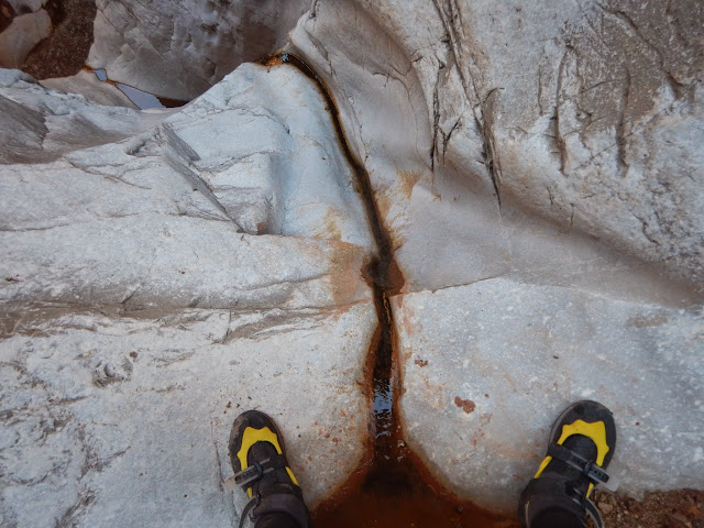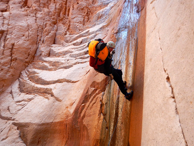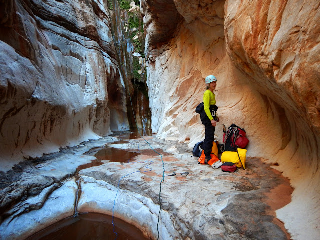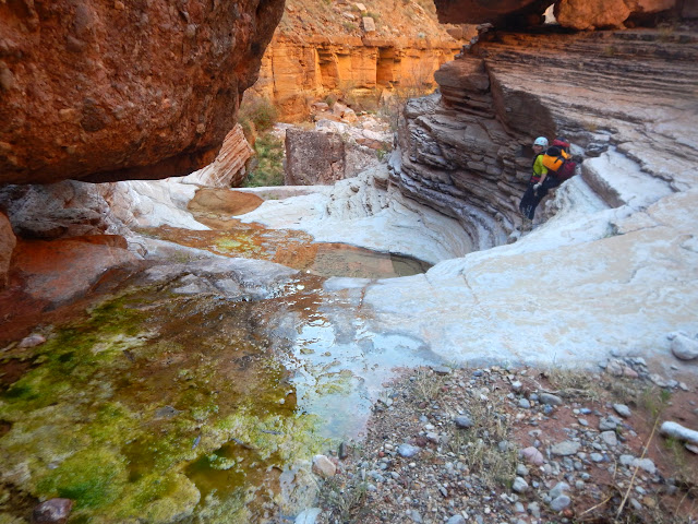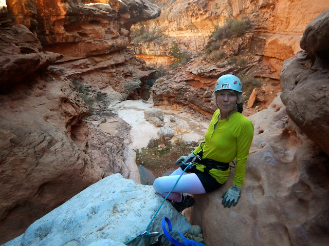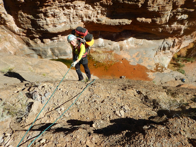 The hours evaporated, like the sweat did, during our frequent breaks. The sun had reached a lower angle by the time we found our way into the canyon. While we had shade now, the rougher and dropping terrain was working me over pretty well. You either push your pack around or your pack pushes you around. Clearly the later was happening for me. Or is it better to say "happening TO me?" I teetered, toddered and struggled mightily. At least I had a lighter pack for the rappels, as the big rope was on the wall and not in my pack.. Jenny had to hang her "beast" of a pack every time the rap went free and use a chest harness rig for all the other raps.