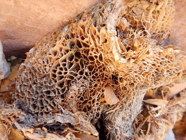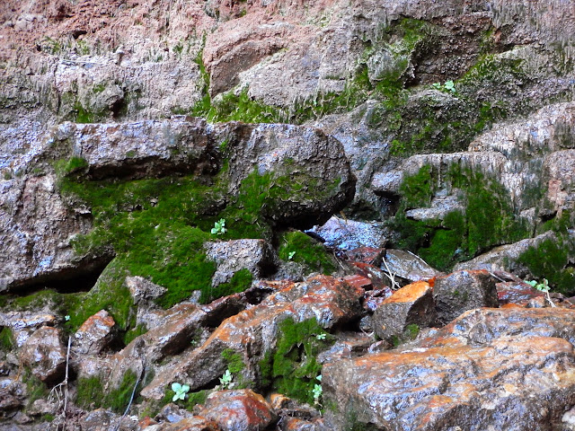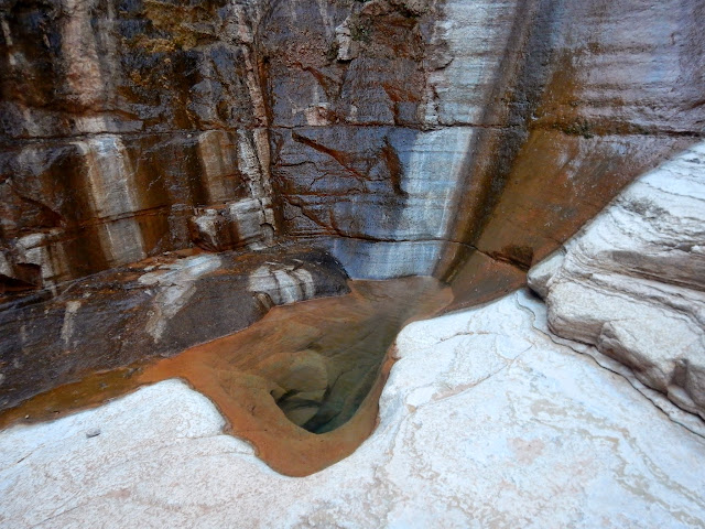 The next day we would only cover 3 miles or so., but the tide would turn. Time would be eaten up by big packs and big raps and a pair of boulder filled sections, but the packs got more manageable, a lot for me and a bit for Jenny. We gained strength. That was part of it. I wore my wetsuit to the waist. While that was a bit 'swampy" it was easier than carrying it. Carried less water and drank on the fly. A day's less food too. It all added up. It only takes a few pounds to cross the threshold between being pushed around and pushing your pack around instead. We had a fine camp this night and we carried on an extended and interactive conversation with an owl and were visited by a ringtail cat, at midnight.