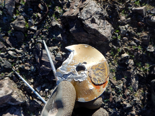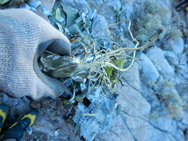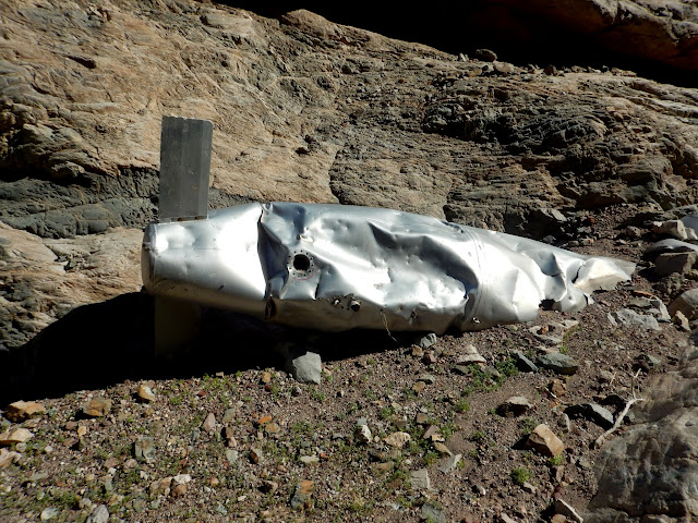 We used GPS to mark the perimeters of the crash site. Some day, the debris may get removed. Perhaps not, but the information has been gathered and the site accessed. Nine members of CAC joined Charlie and Search and Rescue Ranger John Dormen. The group moved well over the complex, steep and loose slopes surrounding the crash site. The conversation was lively all day long.