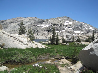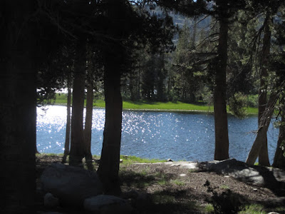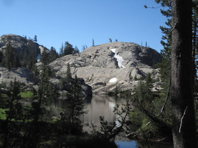 The climb down into Bucks Lake has never been our favorite--steep and clunky with lots of big steps, loose stones, and eroded trail. But there is that lovely moment when you see the deep blue water of the lake through the trees--and it promises a water break, a snack, and an end to the descent. We'd heard by this point that the mosquitoes at Emigrant Lake were horrific, and that was our next stop.