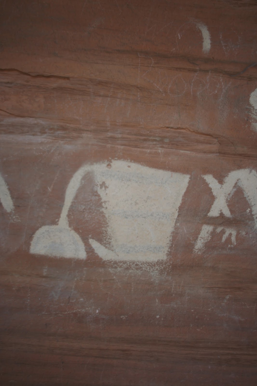 The rock art here is heavily damaged, probably by a combination of vandalism and flash flooding. Also, unlike the two earlier panels it is painted and not pecked or carved from the rock. There are four partial anthromorphs together in a group and several other solitary ones nearby that are not in as good a condition. They all have the typical trapezoidal shape of Fremont figures, but the heads are eroded away so it's impossible to tell if they also had horns or not.