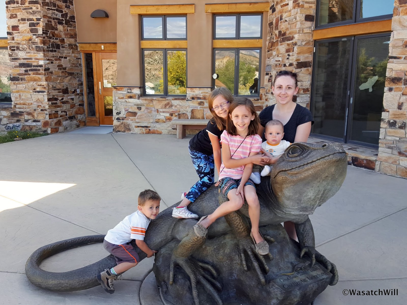 Satisfied with our finding and study of the dino tracks, we got back on the road and headed back for the town of Escalante where on the outskirts was the Escalante Petrified Forest State Park. Had the kids not been with us, we probably would have paid the fee to hike the larger loop trail there, but instead opted for the lower cost paved trail that takes you through a display of several impressive and colorful pieces of petrified wood that have been collected.