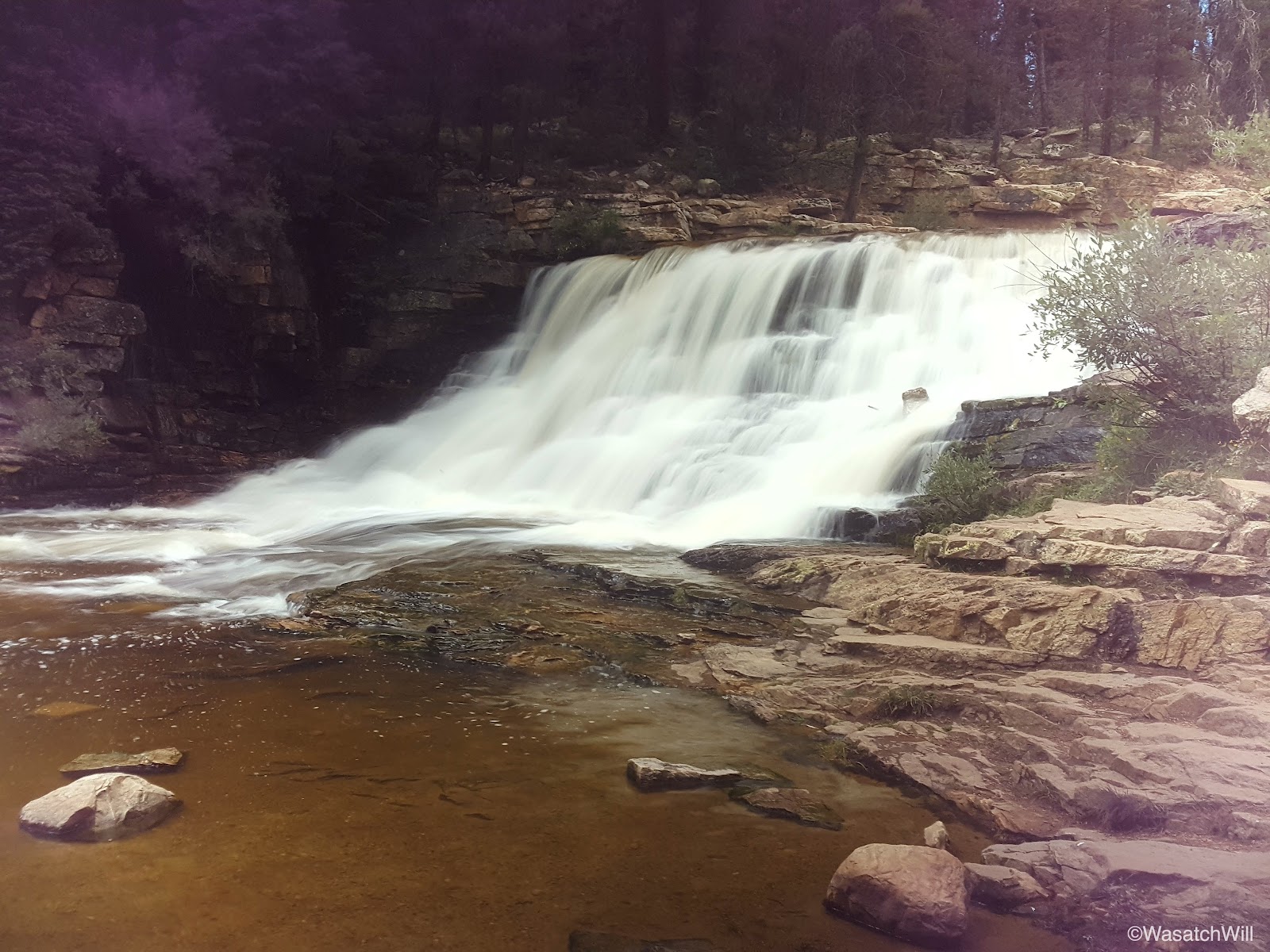 Before arriving at the trailhead, we pulled over for a brief visit to the Upper Provo River Falls. The is a very popular spot for people driving the Mirror Lake Highway to get out, stretch their legs, take some pictures, take a potty break, or otherwise just enjoy the sight and sound of the thundering Provo River as it cascades down a series of large rocky steps.