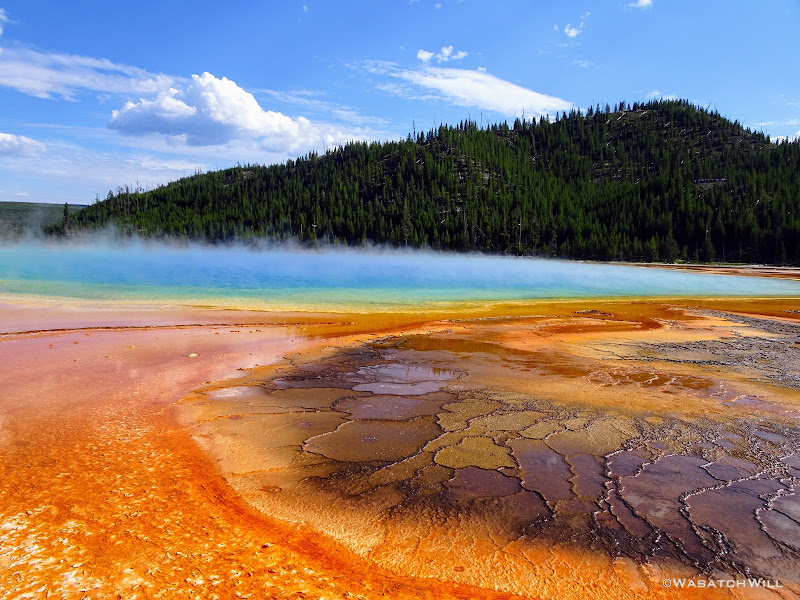 However, the kids felt like they already got enough walking in for the day with the Brink of the Lower Falls and the Fountain Paintpot trail and all that. It was also getting to be a little later in the afternoon than I had hoped. If we did Fairy Falls, we'd likely be getting back to camp with virtually no daylight left, and that was certainly not something we wanted to be doing. So, the decision was made to sacrifice Fairy Falls for a time when every one was a little older and more willing and more capable of hiking the longer distances in much lesser amounts of time. Instead, we'd now commit to getting involved in the traffic and crowds to get into the Grand Prismatic parking area for the up close look at the Park's iconic hot spring. Of course, there was the almost equally impressive Excelsior Geyser Crater to see too.