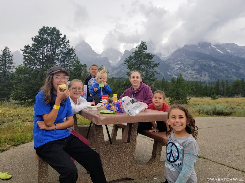 We eventually gave up on catching a parking space becoming available and moved on further down the road until we found a fully vacated parking lot and empty table at the Teton Glacier Turnout. This would do.