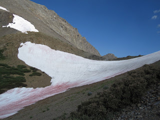 We paused for a rest, a consultation, and a quick bite of energy bar. The only possible route was clearly up the left side. I led the way as we descended a steep slope of scree down to the snowfield, using what might have been a few diagonal use trails from years past. The snowfield was hard and slick at that point, but almost dead flat, so there was no real danger.