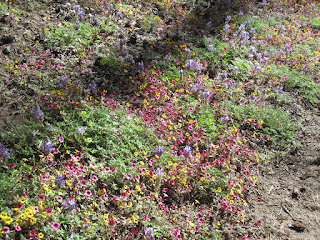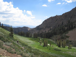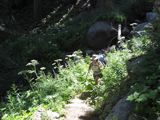 But we were over the pass, headed downhill, and a warm shower was now something more than a fantasy. We met our first hikers of the day just at the junction for Franklin Lakes, and they were dayhikers. The flowers on this part of the trail were amazing, and we also saw deer, marmots, lots of butterflies. After the windy night at Bullion Flat, it was paradise. And down we hiked, on and on. Lordy, but this trail has a lot of switchbacks.