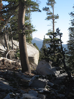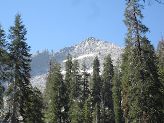 We left our packs at the junction of the Cahoon Rock and Evelyn Lake Trails so we could “dayhike” up to Cahoon Rock to enjoy the views. Which were nice, but they were much nicer fifty years ago before the current crop of trees had grown up. We did get some views of the King’s Kaweah Divide, and also of Hengst Peak and its environs, but later discovered that the view of the latter were just as good from the trail to Evelyn Lake. Eh. We did notice that there were a number of stumps along the top of the ridge by Cahoon Rock, and couldn’t help thinking that some time in years past, either private individuals or the Park Service had “improved the view” by taking out some of the taller trees. Thank God times have changed.