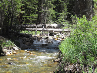 But we couldn’t get lost. There was only one trail, and it continued first Southwest, then curving and twisting South towards Hockett Meadow. National Geographic gave the mileage to the meadow at 9.9, but Sequoia National Park said 12. Hmmmm. This was a pattern we found for the rest of the trip. At any rate, we began to worry about the mosquitoes we might find if we camped at the meadows, and so resolved to take a look at the next couple of creek crossings to see if we might like to stop short and stay at one of them.