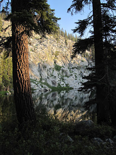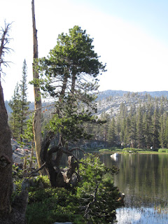 Lake access was a bit complicated because the water was so high, and much of the grassy shoreline was under water. And we never did find a trail around the lake. The talus blocks were just too big and awkward. We had to pre-filter all the water through a bandana to remove some of the pollen and dust we could see floating in the water, and I was limited to only a few spots that were accessible to fish. I still caught four lovely brook trout about a foot long. We also found a cache of tents stakes here that someone had left…and we left them at the Hockett Meadow Ranger Station the next day. Another wonderful warm afternoon was followed by a quite amazing twilight, as this lake sits on the very Western ridge of the Sierra, and gets the last rays of the sun as it sets behind the smog of Visalia and the Central Valley.