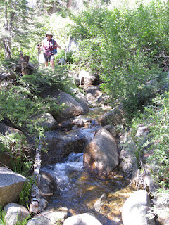Finally, after taking the better part of an hour to hike less than a mile, we came out into the sun-baked rocks of the Little Kern. This was the only section of the trail that was hot, baking both from the lower elevation and the heat radiated from the trailside rocks. And all the while, we worried just about bit about how we were going to be able to cross the creek we could hear roaring down below. Ah well. That turned out to be the easiest part of the whole day. A lovely wade, calf deep, in an icy stream after a hot hike. Pretty darn nice. So nice that we had lunch there, and filtered some more water. Now it should be easy to follow the trail up the Little Kern to a campsite below Farewell Gap.
