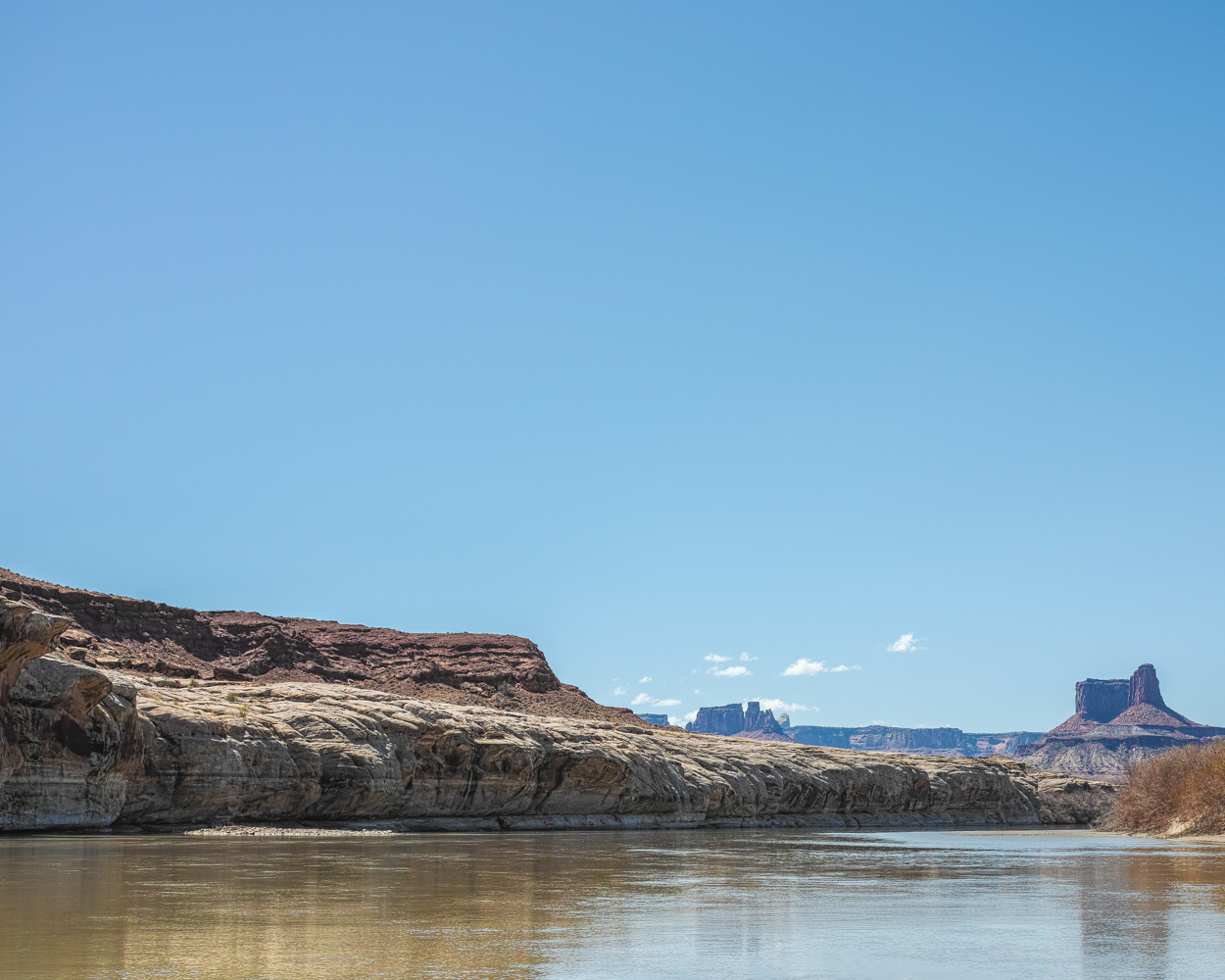 Mineral Bottom (nice take-out/access) denotes the first change. The end of Labyrinth Canyon and the start of Stillwater Canyon. Stillwater runs through the heart of the Island in the Sky district of Canyonlands. The "White Rim" formation can be seen in its humble beginnings in this shot, Buttes of the Cross in the distance.