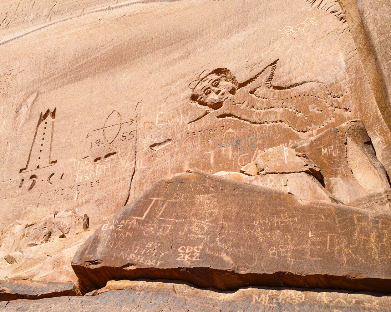 Half way to Mineral Bottom lies the "River Registry." An assortment of many (historical) petroglyphs smattered all over a nice chunk of Navajo sandstone on canyon left. Many of them are historical dating back to the late 1800's and some requiring and incredible amount of tedious labor. While fascinating, I find the aesthetic lacking in comparison to the work of the Anasazi.