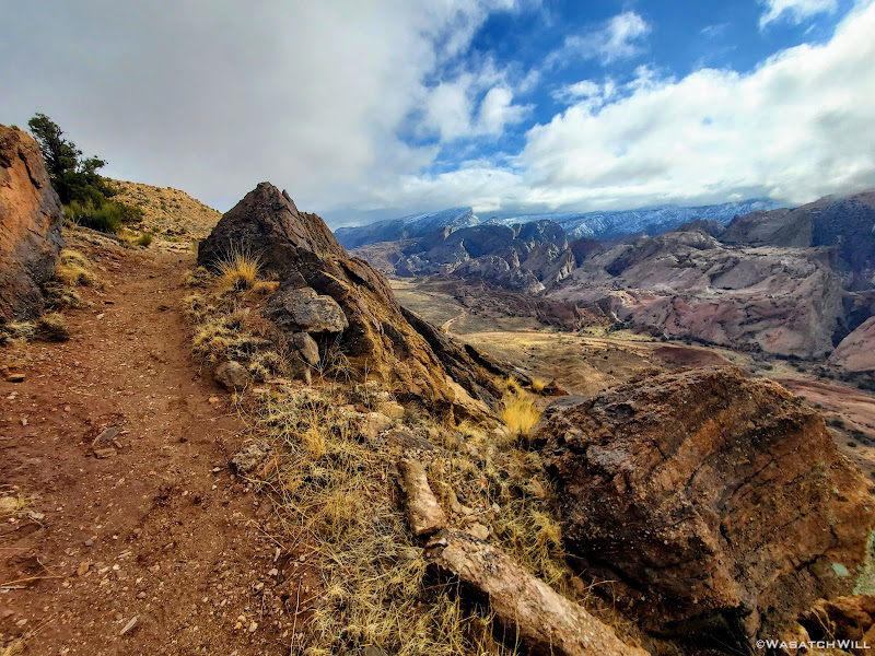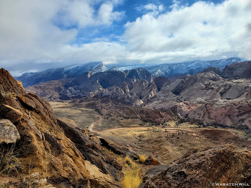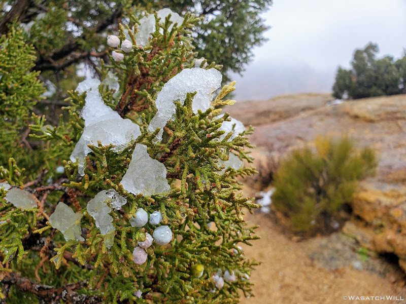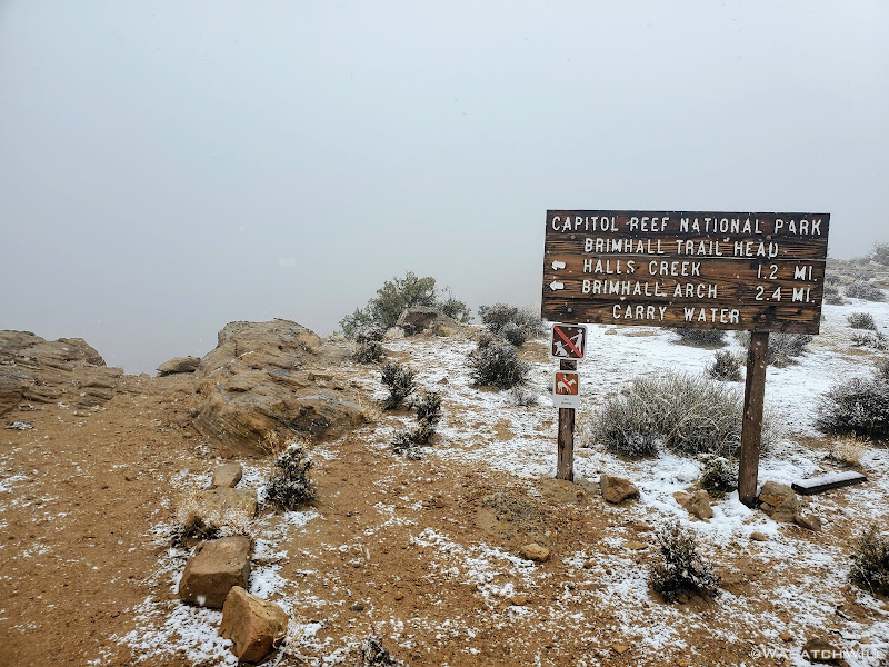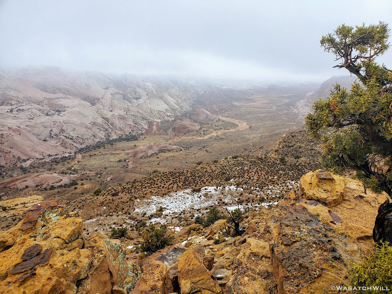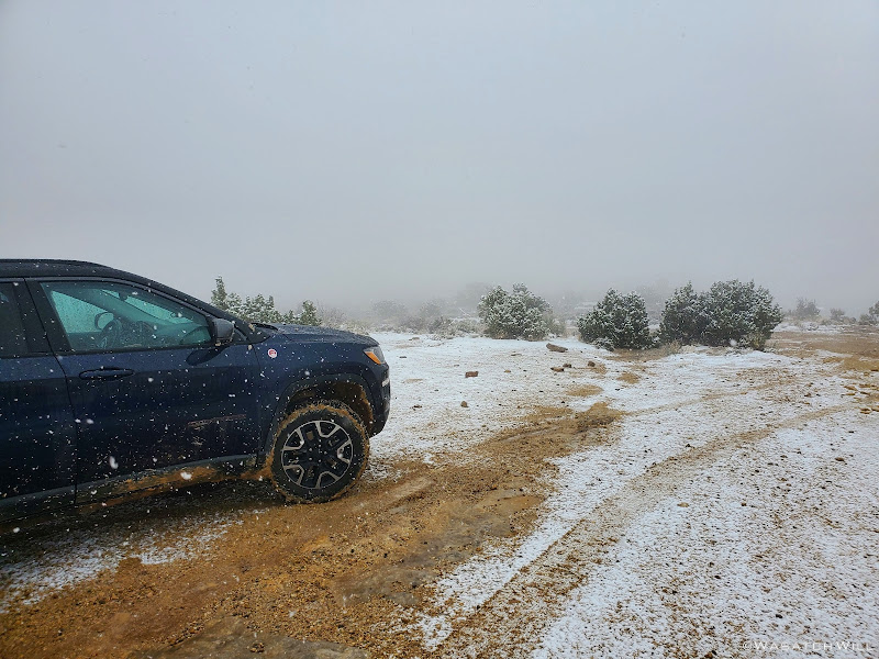 We started the long drive down to the trailhead at Hall Creek Overlook knowing that weather had been iffy earlier in the day, but forecasts had called for favorable conditions throughout the afternoon. However, as we made our way out on the dirt road, lingering clouds began dumping a bit of rain followed by snow making for a slick road. We still managed, barely, pull into the trailhead. We pulled another forecast on our satellite devices as we considered alternative contingency plans.