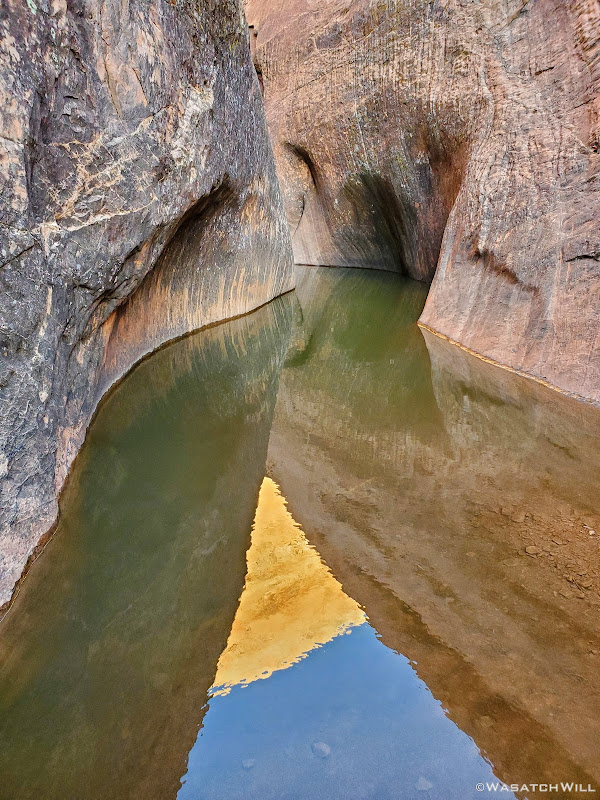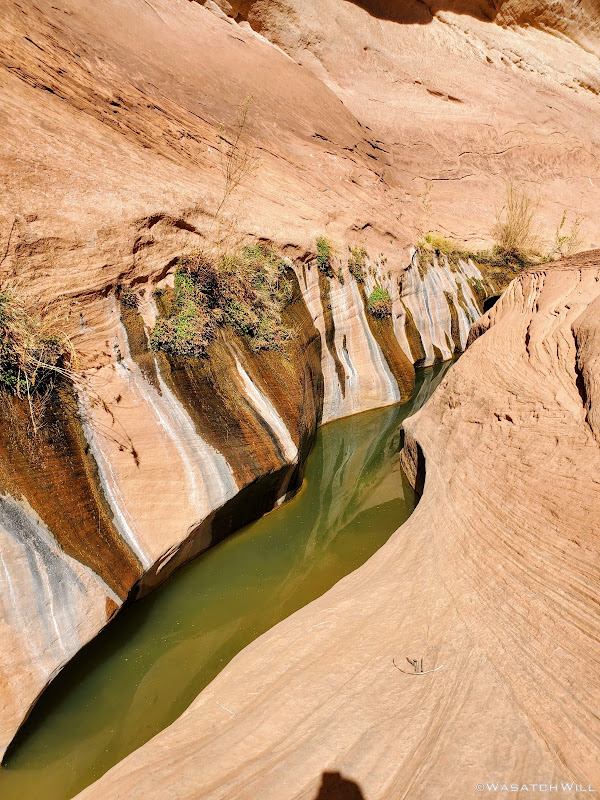 Near the end of the narrows came the crux of the route: A long narrow pool that in years past, had been nothing but a waist-high wader. At some point in the last year or two however, floods had washed out much of the built up sediment and sand, deepening the pool such that in order to get through it, one now has to swim for short stretch. Had the air above it been much warmer, it would have been an easy decision to go forward with the swim...however, we ended up opting for a more creative way to bypass it. We were able to assist each other in gaining the bench above it to the right of it and follow that around to the other end of the pool, where we were able to descend and slide down a very steep ramp to return back down to the creek bed.