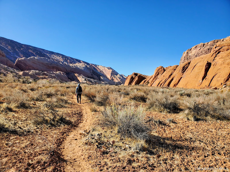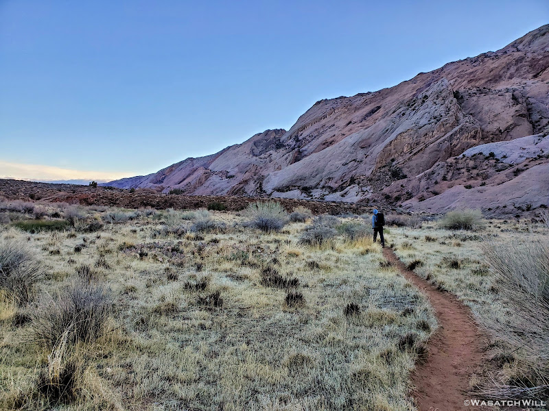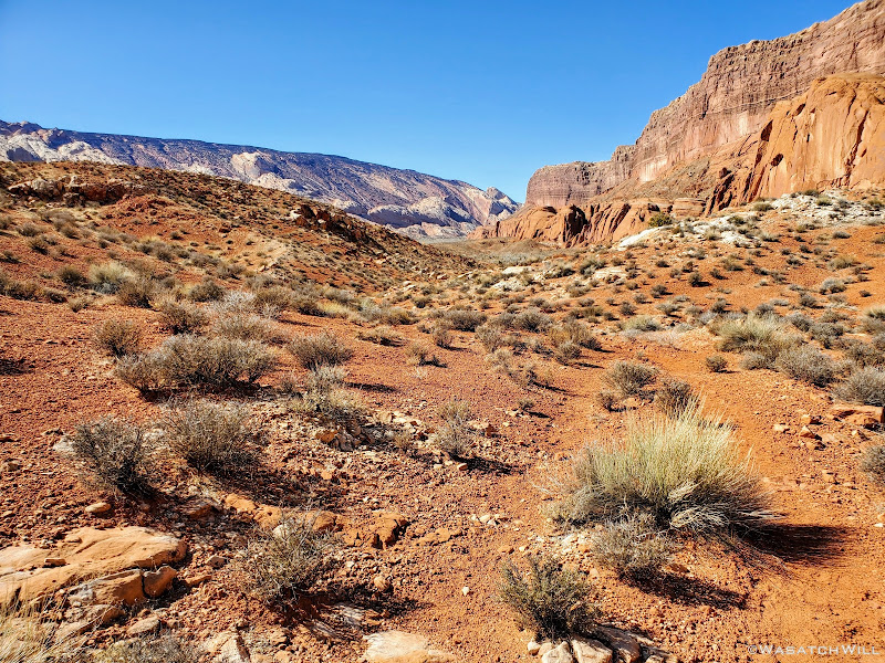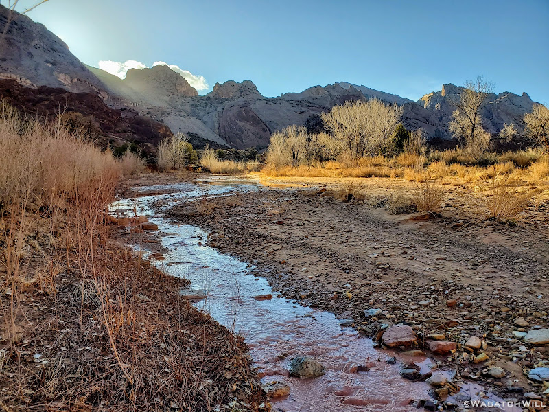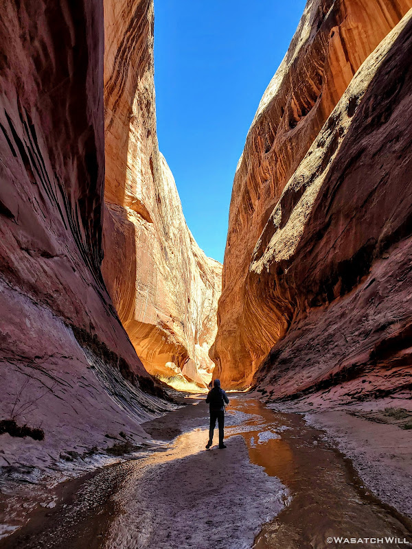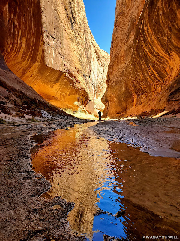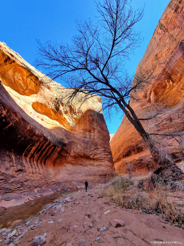 When my friend Devin contacted me about wanting to do a weekend desert trip, he had been keen to do an unknown route he had strung together down on Cedar Mesa, but for various reasons, that was put on the back shelf. We then started considering a loop in Capitol Reef through Lower Muley Twist, but we were not sure how icy a crux spot along that route might be, if there was any left at all, especially with recent wet weather and below freezing temps at night. There was another route I had strung together to explore an unfamiliar canyon in the northern part of Capitol Reef but again, that too was shelved for another idea I had pitched to him: Halls Creek Narrows. Since Devin had yet to experience that himself, I was able to convince him that this would be a perfect opportunity for him to check that one off.